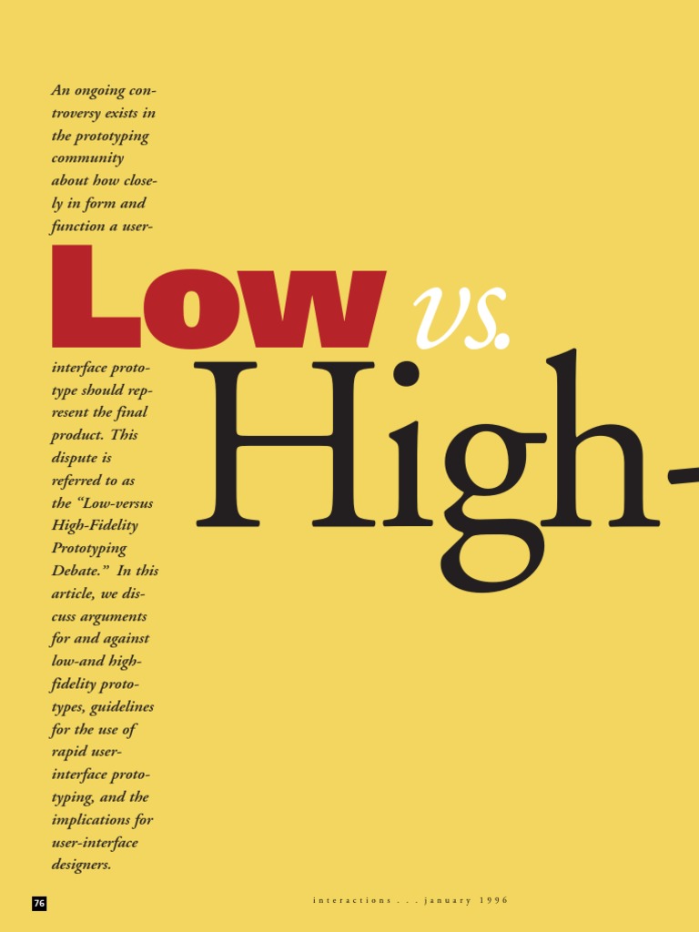High fidelity prototyping, and low fidelity prototyping low fidelity prototype. They are suitable, for example, at an early stage in your design process to find out what users think of your concept (and whether they need it at all).